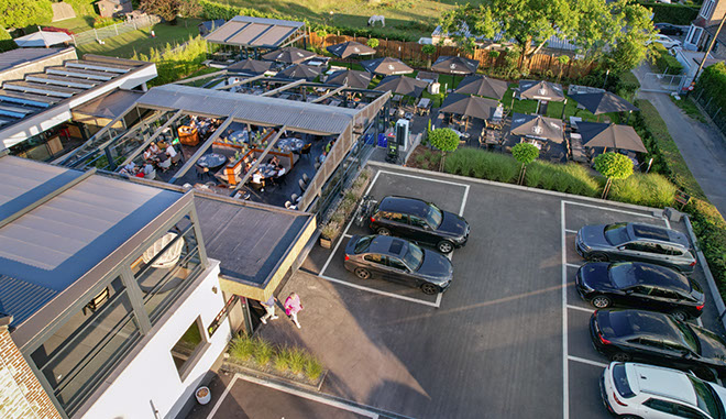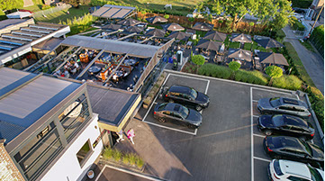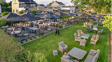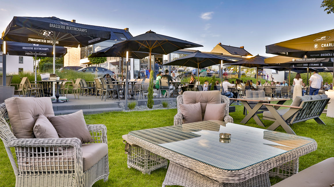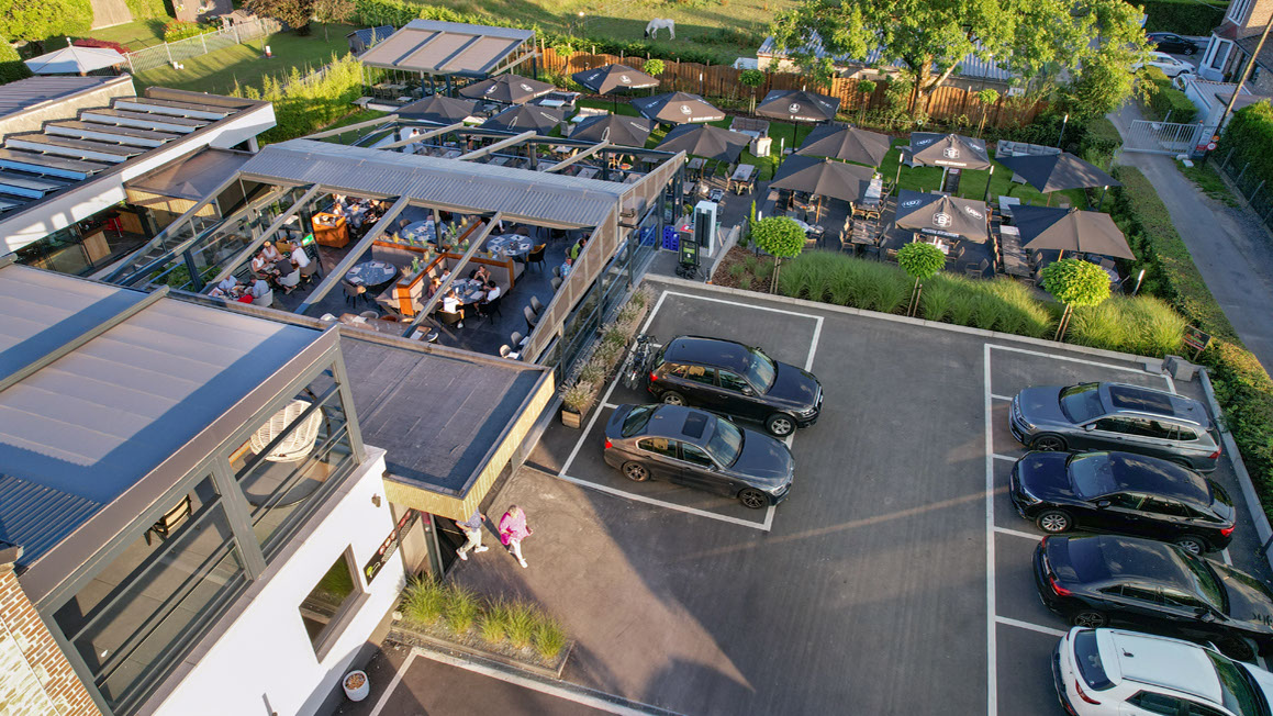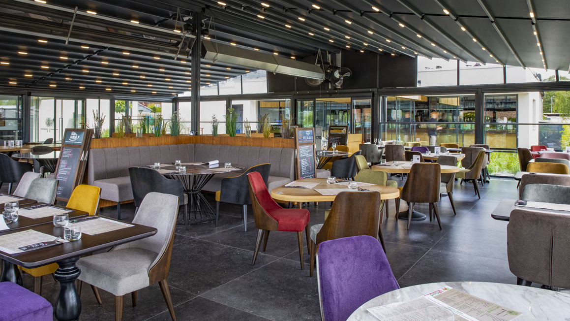 Profitez d'un repas en terrasse, sous un parasol ou dans la véranda chauffée, modulable, à la toiture escamotable.